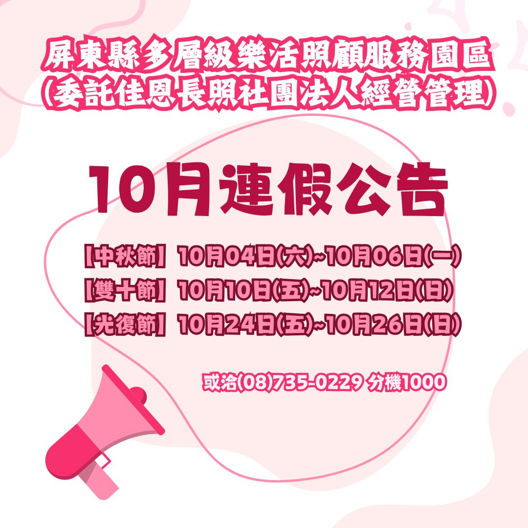 10月份園區各連續假日如下:【中秋節】10月04日(六)~10月06日(一)【雙十節】10月10日(五)~10月12日(日)【光復節】10月24日(五)~10月26日(日)連假期間,本機構行政部門及銀髮健身俱樂部課程暫停服務與上課。